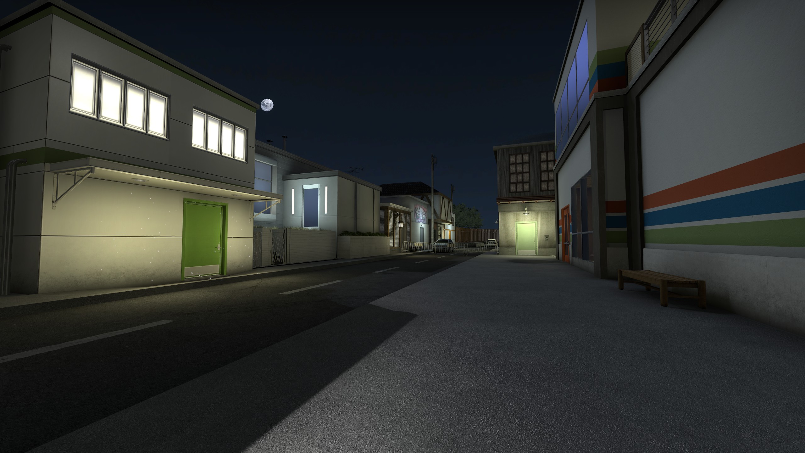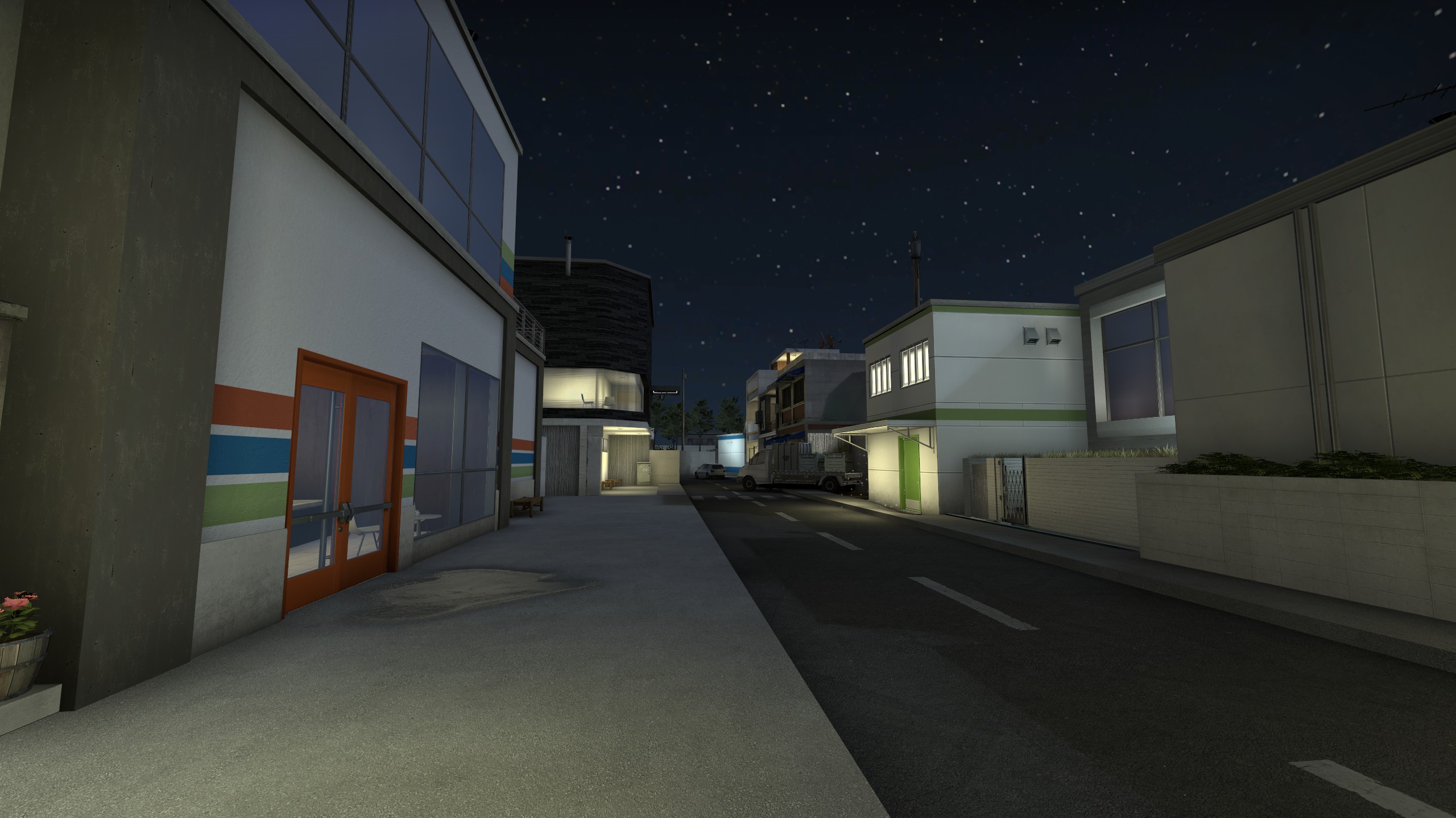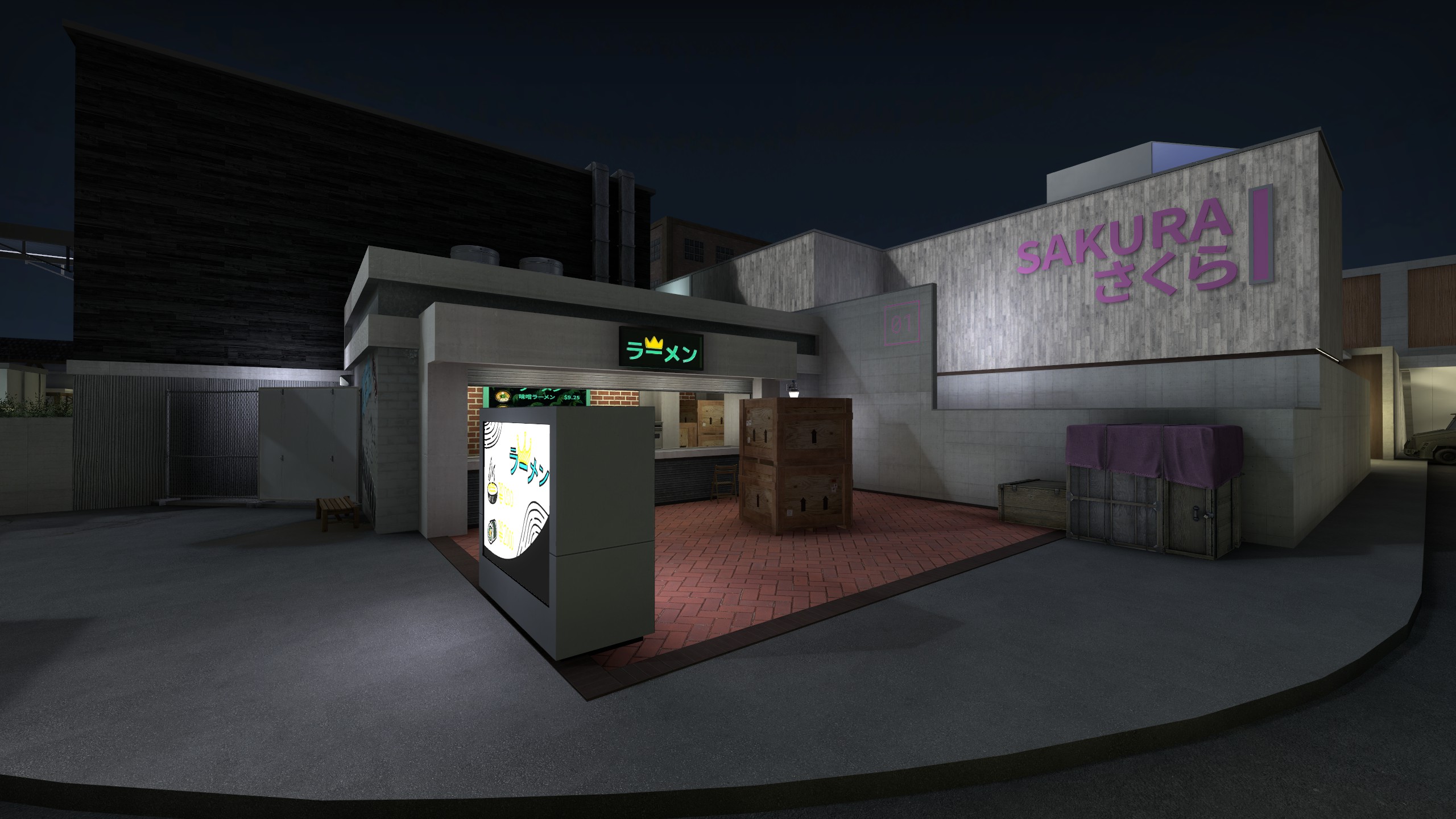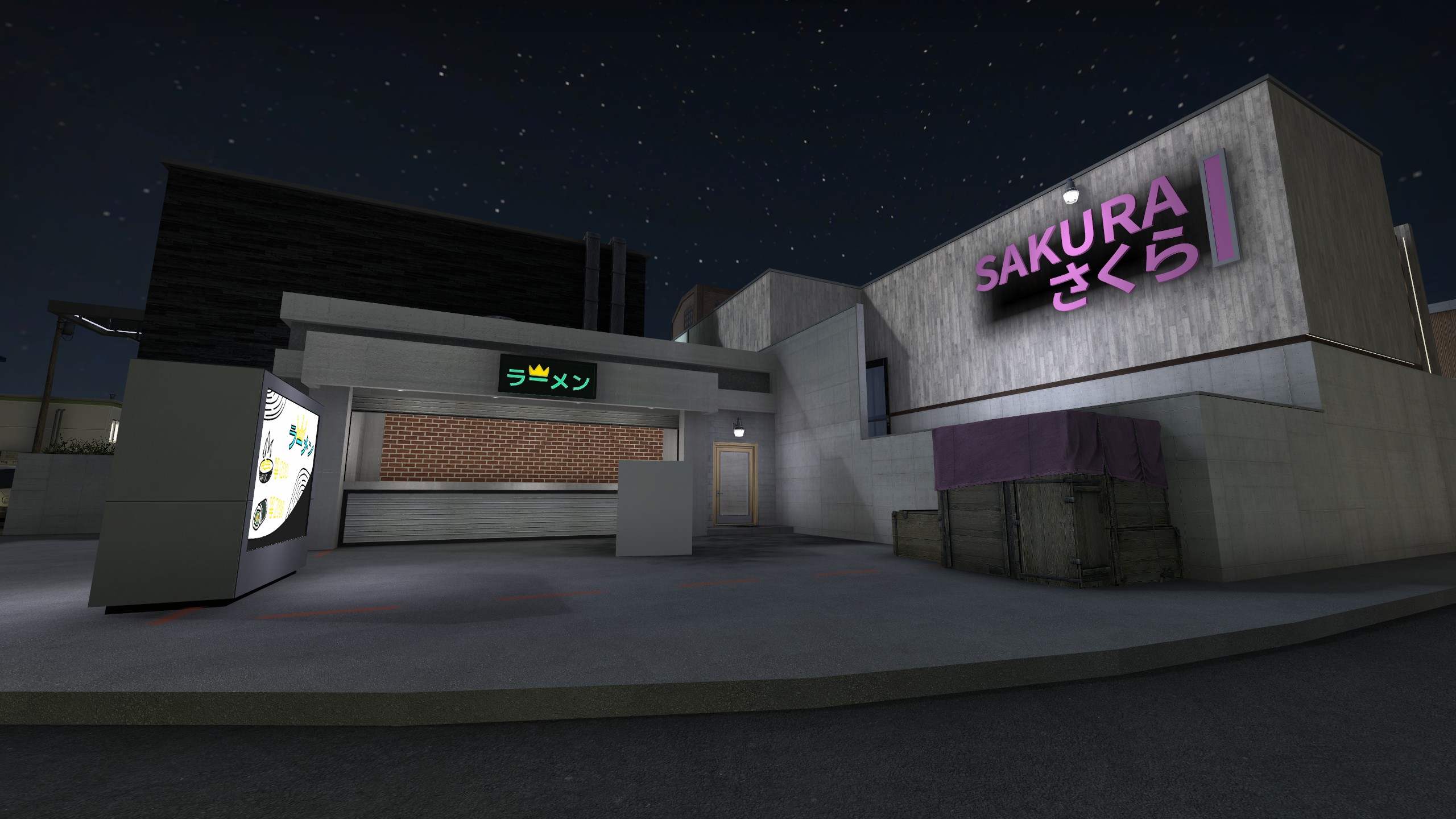 Sakura is a map for Counter Strike: Global Offensive (I am working on a CS:2/Source 2 port), created for the 2020 Mapcore Wingman mapping competition. It is a 2v2 competitive-focused 'Wingman' defuse map set in a Japanese town caught in the transition into the internet age. It was the first mapping project which I completed the full production process for, from planning and greyboxing to creation of art assets and polishing for player experience. It performed well in the competition, placing in the upper half of all 100+ contestants, an accomplishment I am proud of for the stage in my learning map-making that I was at, and for having done it entirely on my own.
